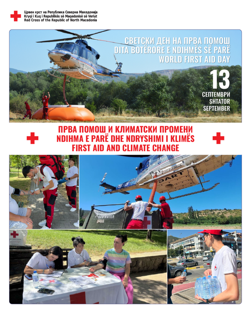 На 13 септември 2025 година, Црвениот крст на Република Северна Македонија ќе го одбележи Светскиот ден на првата помош под мотото „Прва помош и климатски промени“. Првата помош претставува витална иницијална интервенција која спасува животи и ја намалува сериозноста на повредите. Во услови кога климатските промени предизвикуваат сè почести и поинтензивни екстремни временски појави како топлотни бранови, поплави, суши и шумски пожари, знаењето за прва помош е од особено значење.